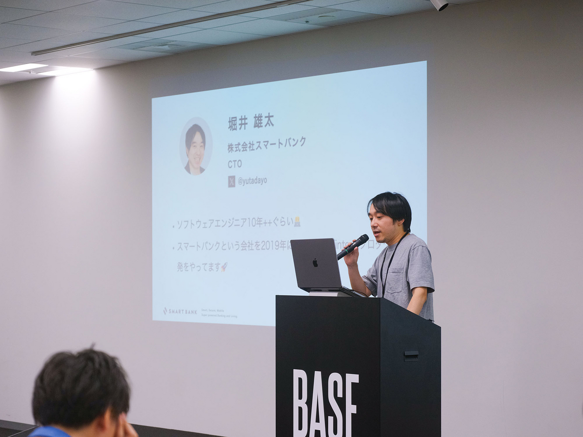 次に株式会社スマートバンクのCTO堀井さんから”カード発行会社(イシュア)を支えるシステム解説”というタイトルで「B/43」のアーキテクチャについて発表いただきました。